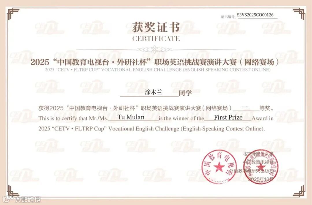 近日,在2025年“中国教育电视台·外研社杯”职场英语挑战赛演讲大赛(网络赛场)决赛中,我院空中乘务专业学子涂木兰凭借出色的英语演讲能力与稳定的临场发挥,从全国1000余名选手中脱颖而出,荣获全国一等奖!