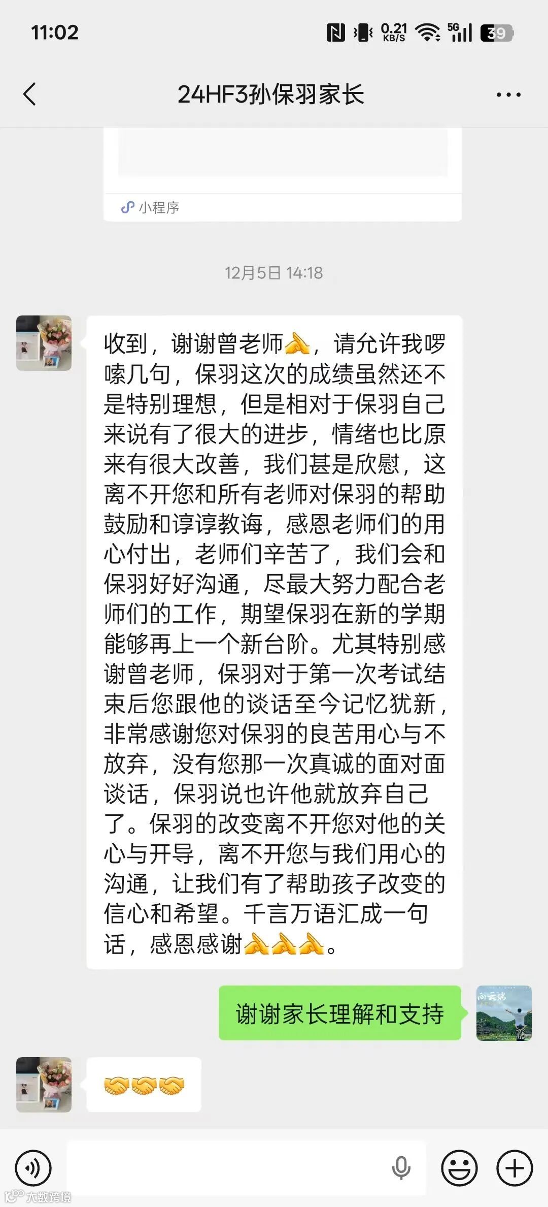 这一切的变化,正是成长最好的见证。程老师只是淡淡地说:“其实每个老师都会这么做。”可我们都知道,这句话的背后,是日复一日的留心、是一次又一次不放弃的靠近。他用行动证明,真正的沟通始于真诚的倾听,成长藏在每一次被看见的回眸里。