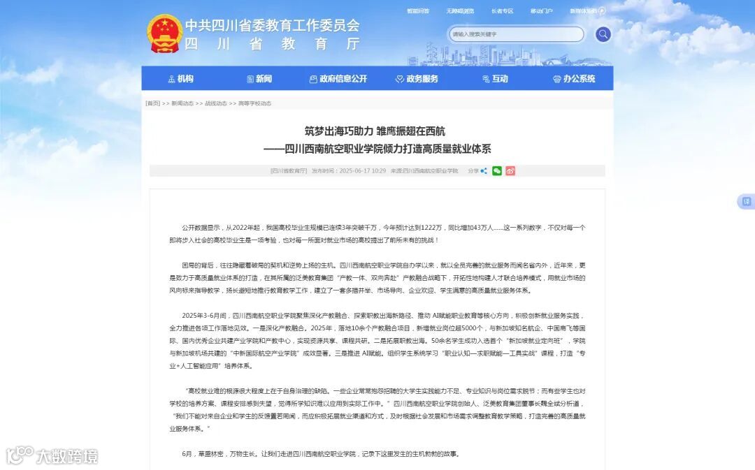 ■四川省教育厅发布《筑梦出海巧助力 雏鹰振翅在西航 》专题报道