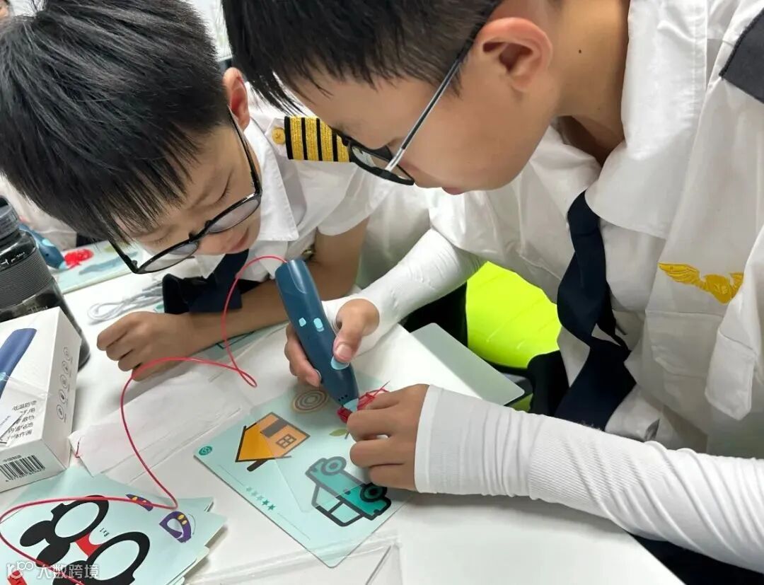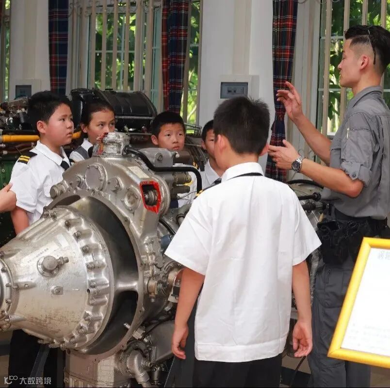 在老师带领下,从机首到机尾,全方位探秘真机。触摸机身,研究铆钉排列;在机翼下,动手实验感受升力;围绕起落架,探究收放机制。