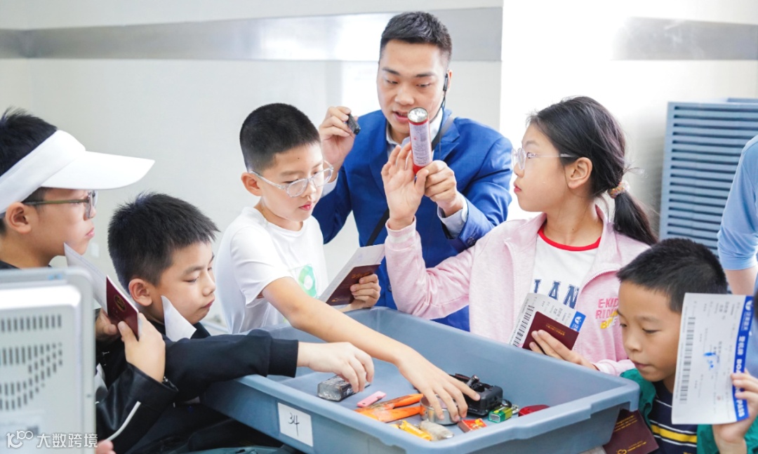 通过课堂讲解,系统介绍值机托运及机场安检的理论知识,利用值机柜台、安检通道,让营员分组进行值机、托运全流程操作练习。