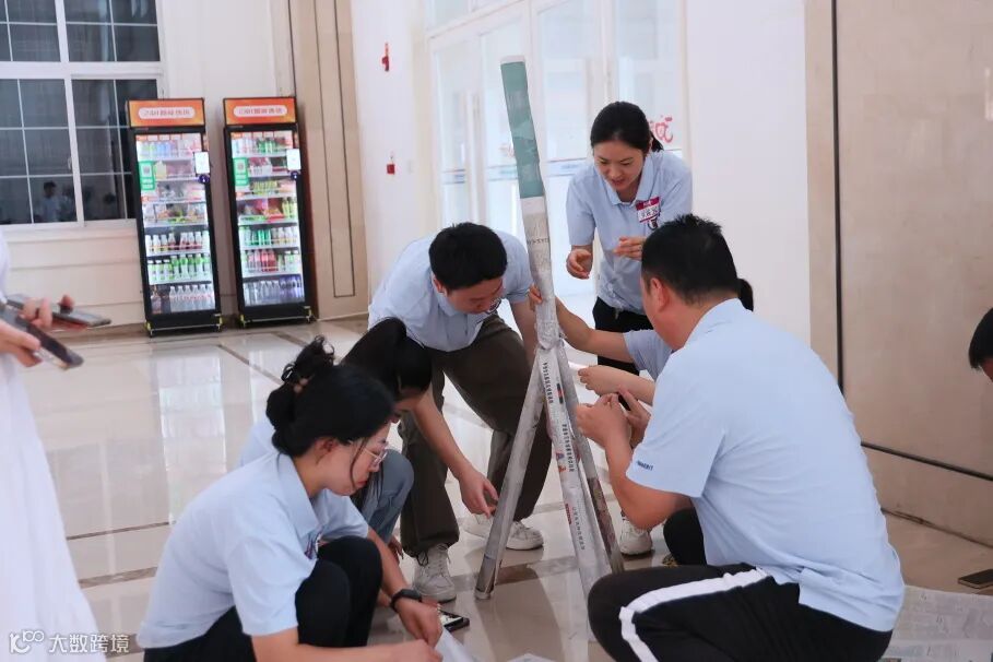 空乘空保系的团建活动在三教一楼大厅热烈展开。40名教师通过抽签随机分成5个小组。大家迅速推选出队长、定下队名与口号,贴上专属贴纸,瞬间燃起团队斗志。
