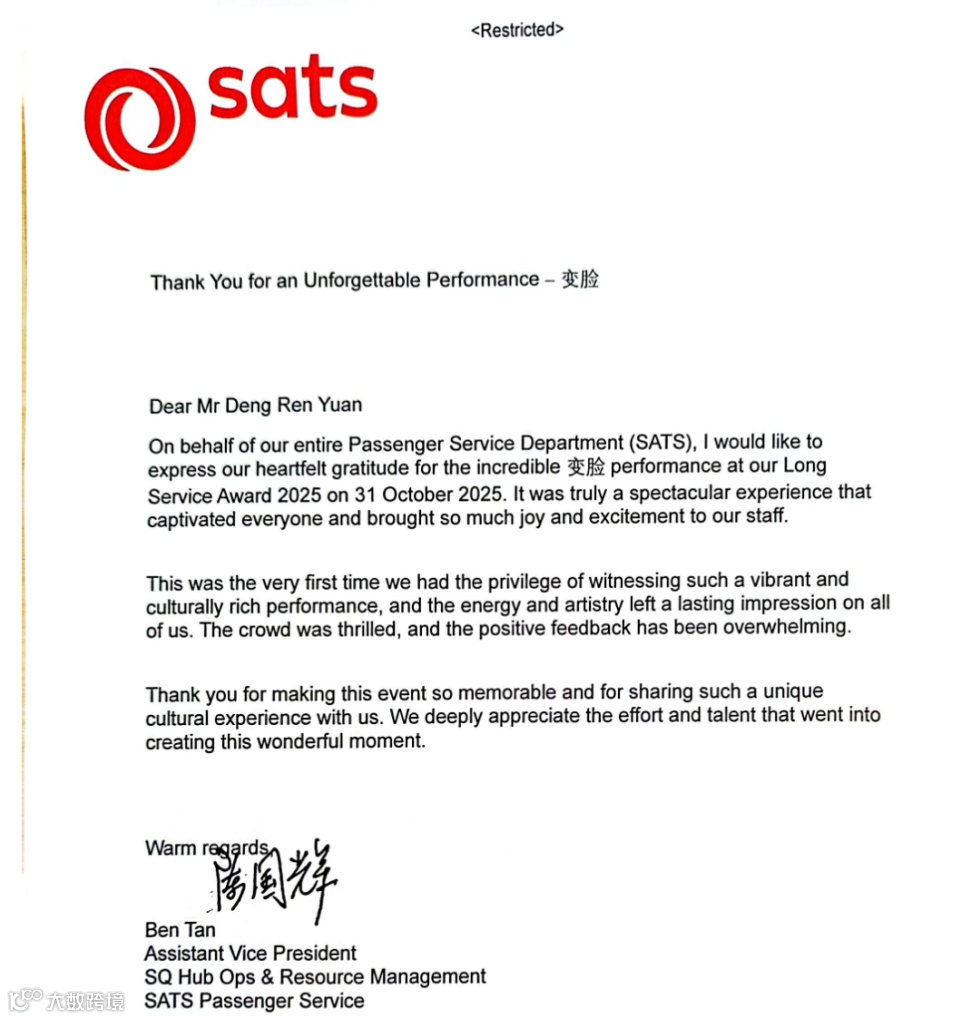 这一切始于10月14日“聚力伙伴·服务全球”2025国际航空服务交流活动。当时,作为西航大一新生的邓人源,在学校的舞台上展示川剧变脸及喷火绝技,精彩表演获得了国际嘉宾的一致好评。新加坡新翔集团领导现场发出邀约,请他于10月30日至11月2日赴新加坡演出。在学校领导的帮助下,邓人源7天办妥护照,如期奔赴狮城。