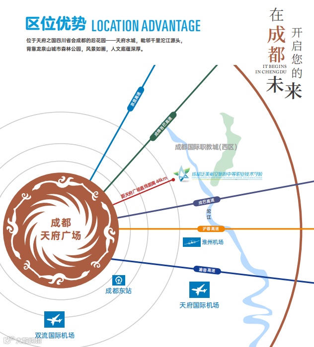 成都泛美航空旅游职业学校位于天府之国四川省会成都的后花园,天府水城一一风景如画,人文深厚的金堂山下,享“双国际机场、“多高速”、“三环线”,地理位置优越、交通便利。从成航出发,几十分钟便能打卡春熙路、太古里、东郊记忆、杜甫草堂、天府广场、大熊猫繁殖基地等网红地,让学校生活圈覆盖成都最耀眼的精彩。