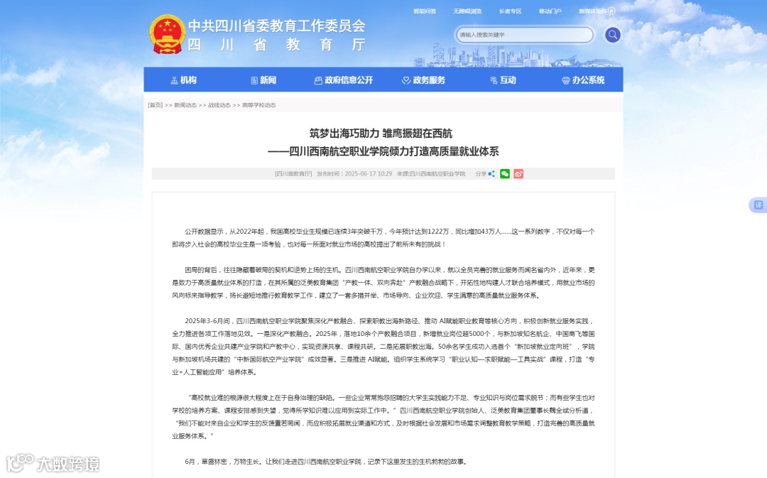 在就业形势严峻的当下,西航更是全力为学生搭建了畅通无阻的就业桥梁,成果显著。四川省教育厅也发布了《筑梦出海巧助力 雏鹰振翅在西航 》的专题报道。这不仅高度肯定了西航在促进学生高质量就业、推动毕业生国际化就业方面所取得的显著成效,更凸显了其在创新就业工作机制、拓宽就业渠道、提升人才培养质量上的标杆作用。