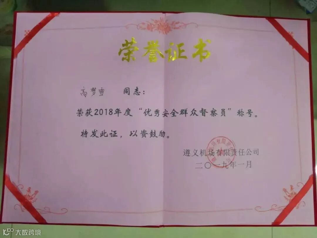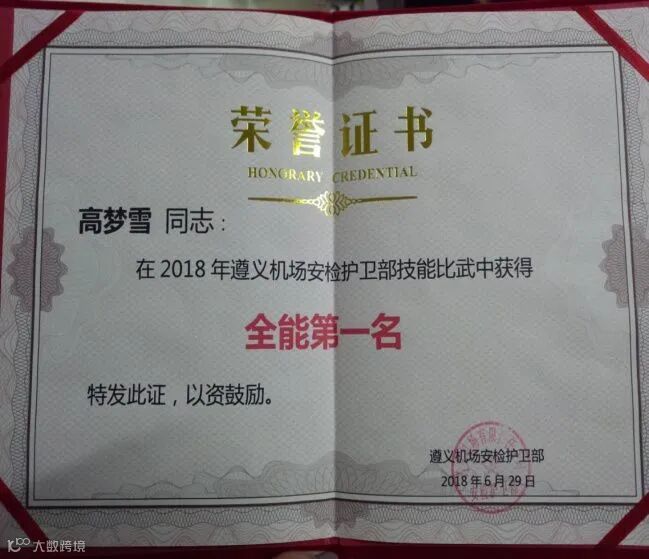几年如一日的坚持,绝非一件易事。外表温柔的她骨子里有着不甘人后的倔强,并靠着这份倔强跨越了一道道体力与心理上的难关。在遵义机场以总分第一名考取中级安检员证书;以总分第一名考取遵义机场安检开机员资质,成为单位成立以来最年轻的安检开机员;考取了“高级安检员”证书;被评为遵义机场“优秀安全群众督察员”……