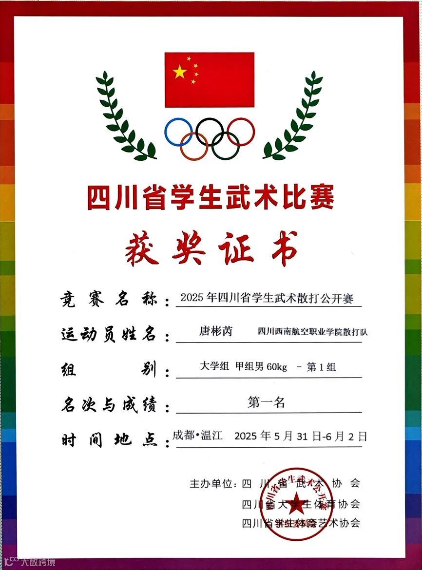 作为西南航院散打队队长,这是我第二次代表西南航院参加学生武术散打公开赛。虽仍有些紧张,但我迅速调整心态,将紧张转化为斗志和意志力。赛前积极调整竞技状态,研究对手,合理安排战术,听从教练指导。经过激烈角逐,我再次夺得金牌。感谢学院给予的参赛机会,感谢指导老师和王院的辛勤培养与鼓励。未来,我将保持进取之心,不断精进散打技术,争取再次为校出征,在西航搏击属于自己的舞台。