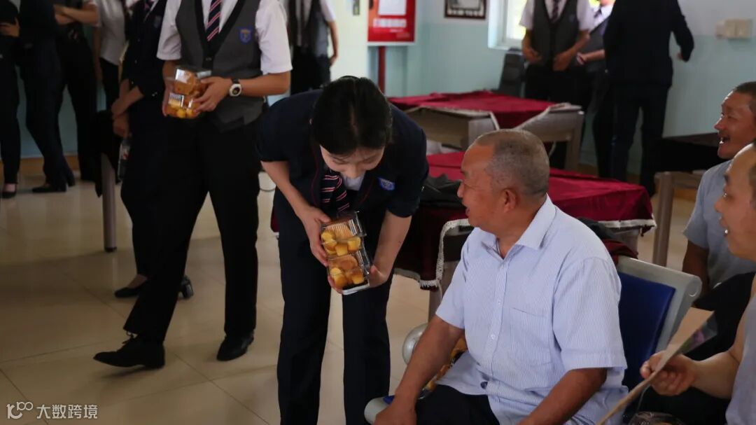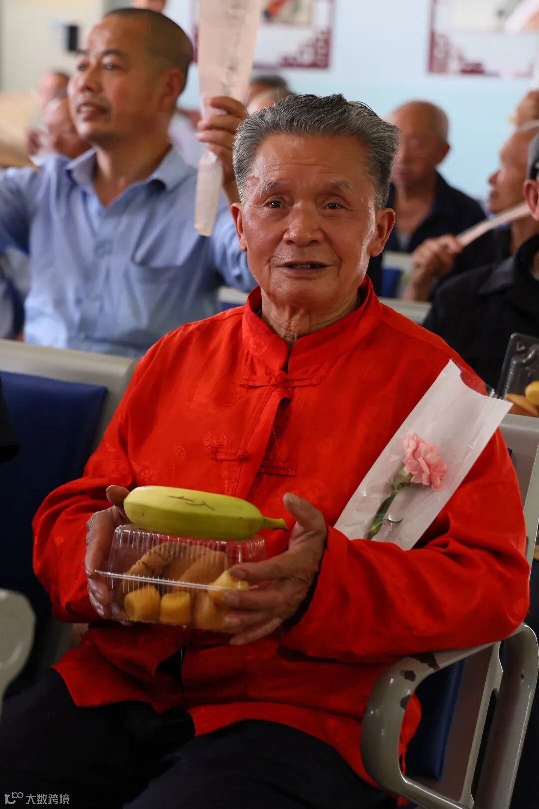 在精彩的文艺表演结束后,同学们开始了温馨的送礼物环节。只见他们分成几个小组,手捧精心准备的蛋糕和香蕉,送到每位老人面前。