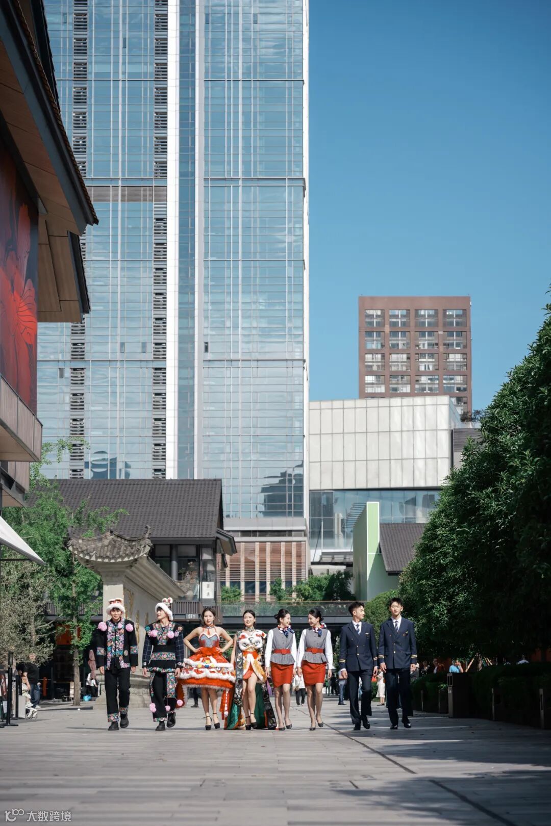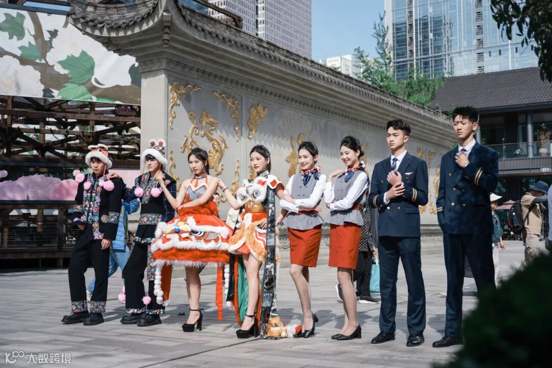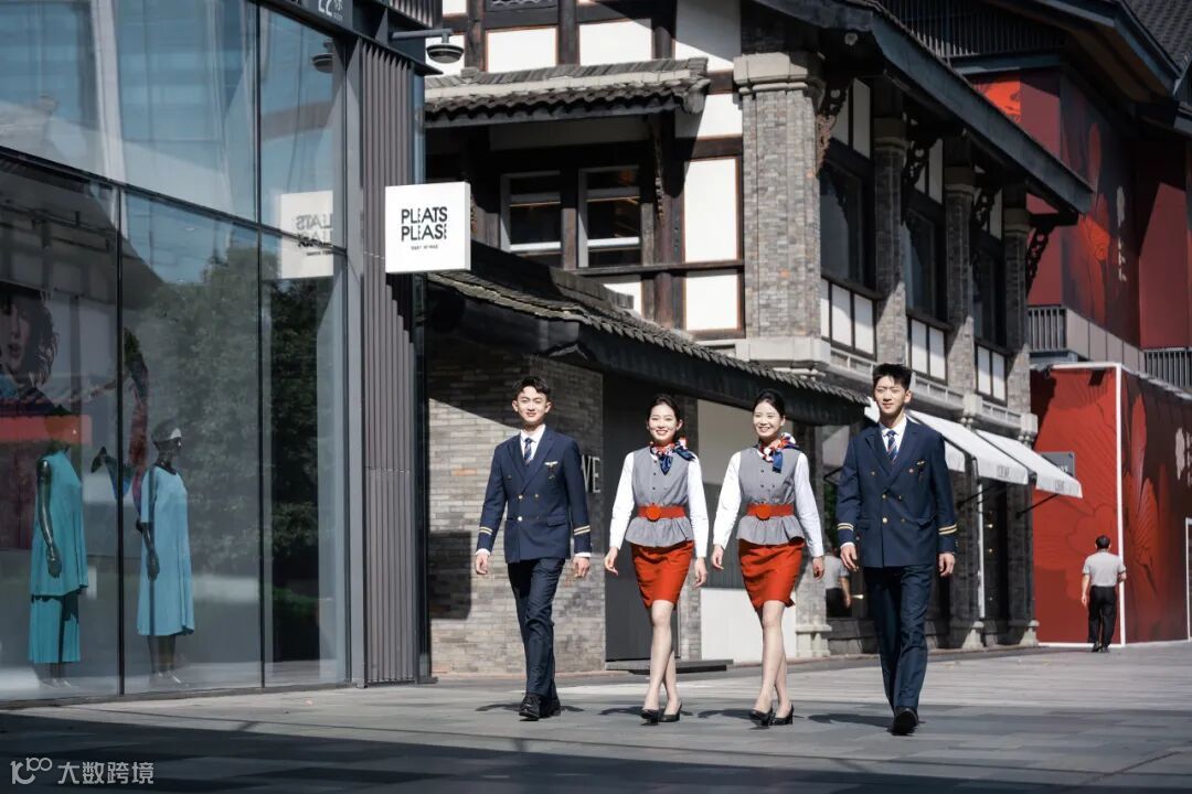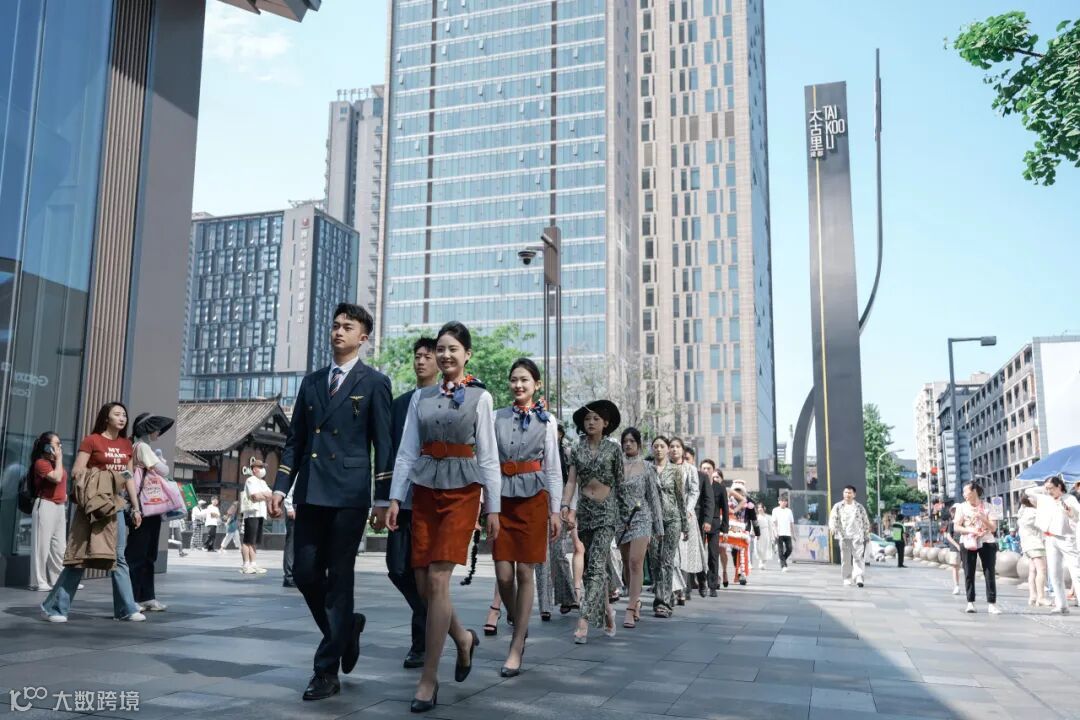 初夏的太古里,波浪形玻璃幕墙在阳光下泛着银灰色金属光泽,墙面上跳动着蓝紫色的光影。身着创意服饰的西航快闪队伍,一经登场,便引爆视觉焦点。
