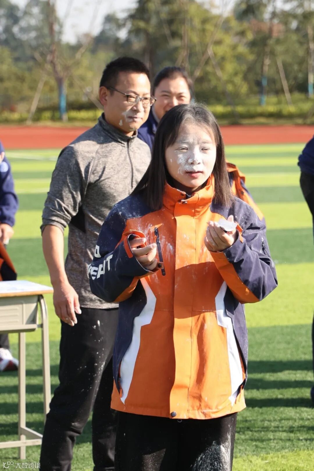 面粉接力,一场速度与搞笑的比拼,有的老师有条不紊,有的老师则沉不住气,将面粉吹得漫天飞舞,逗得现场观众开怀大笑。