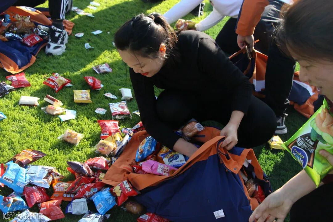 绿茵场上,摆满了成片的零食,一声令下,老师们蜂拥而上,各出奇招,为同学们抢到满满的零食,欢呼声、加油声在赛场上此起彼伏,现场气氛达到了高潮。