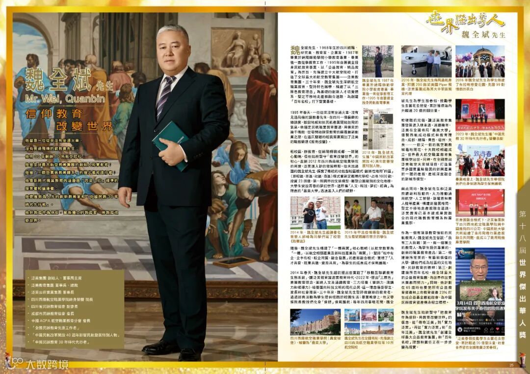 魏全斌先生,1968年生于四川绵阳,研究员、教育家、企业家。1987年毕业于绵阳师范学院小学教育专业,毕业后一直从事教育工作。1995年自筹资金投身民航教育事业,以“公益教育、精品教育”为宗旨,先后建立十大航空院校,打造了全球最大的航空教育集团——泛美教育集团。三十年来,魏全斌先生深耕航空职业教育,坚持特色办学,构建了以“三原色教育理念”为基础的创新人才培养体系,坚定不移地走产教融合道路,为创建“百年名校”打下坚实基础。