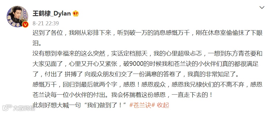 面对突如其来的爆红,王鹤棣则表现得十分谦虚而又真实。在微博上,王鹤棣首先表达了感谢:“感恩!感恩观众,感恩我兄棣伙们的不离不弃,我会怀揣着这份感恩一直走下去的”,他说东方青苍这个角色不是一个人的功劳,而是剧组小伙伴们一起完成的一个作品。