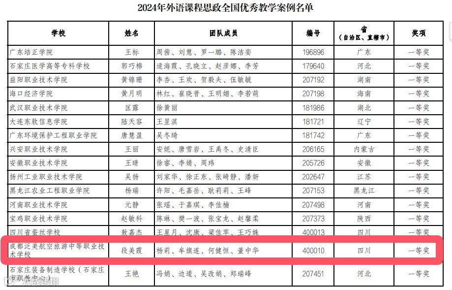 近日,“2024年全国外语课程思政优秀教学案例征集与交流活动”全国总决赛在天津落幕。凭借其卓越的专业底蕴、紧密的团队协作与不懈的探索精神,我校段美霞、杨莉、牟旗连、何健恒、董中华老师组成的外语教学团队荣获2024年外语课程思政优秀教学案例全国一等奖。