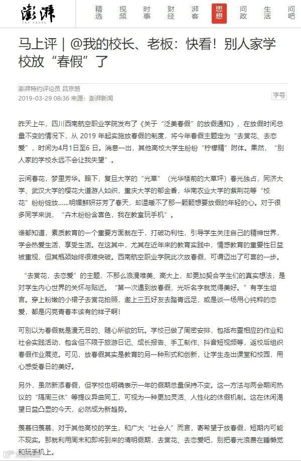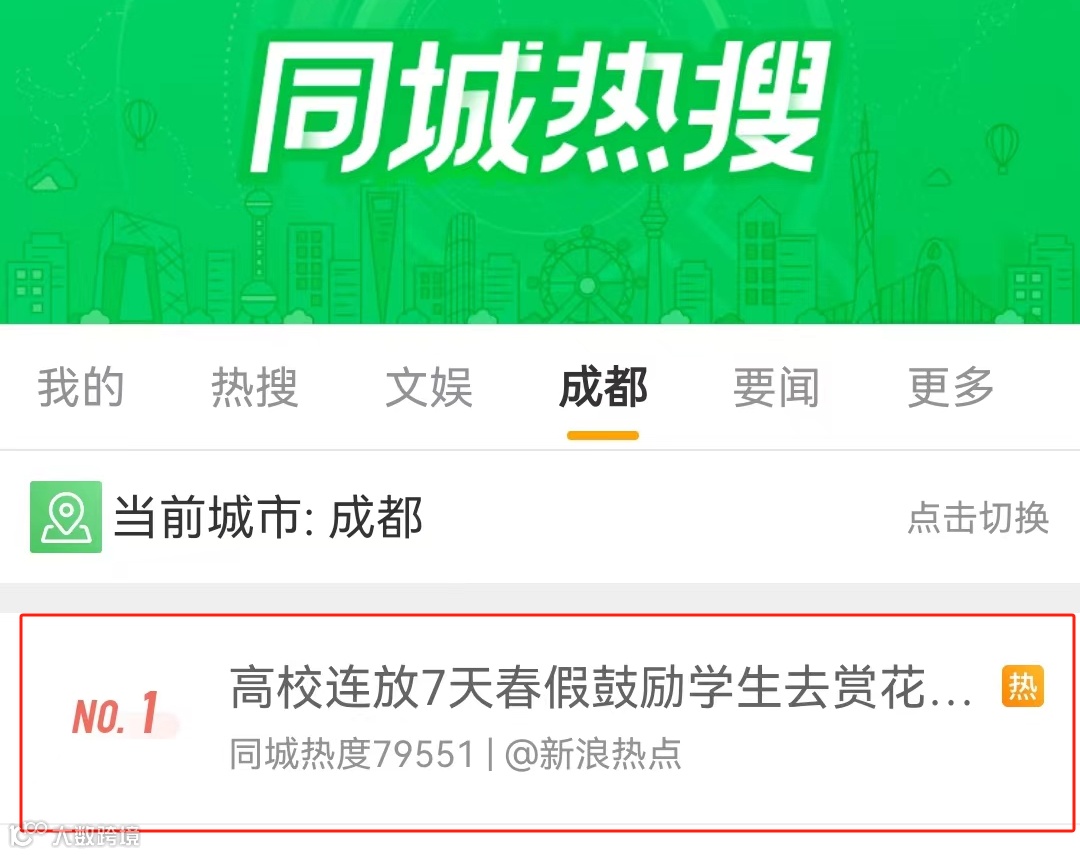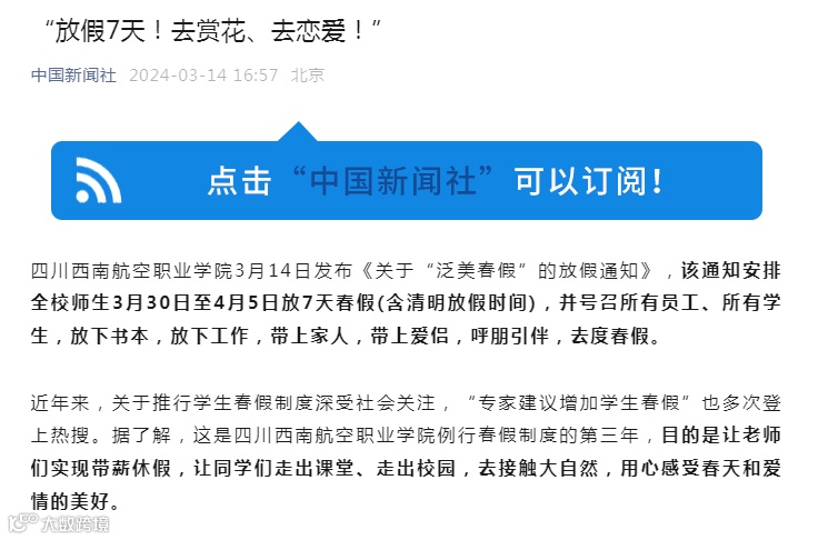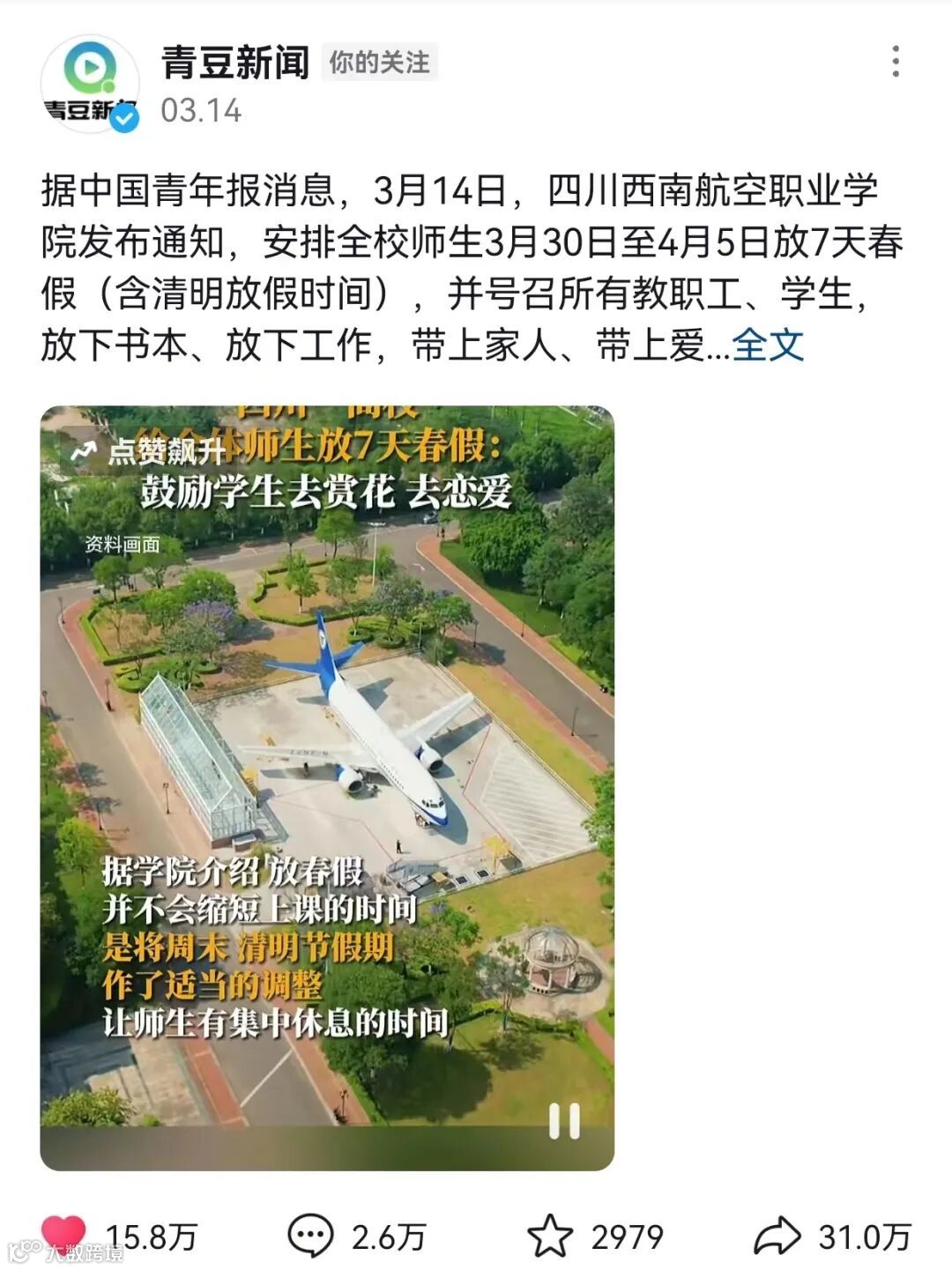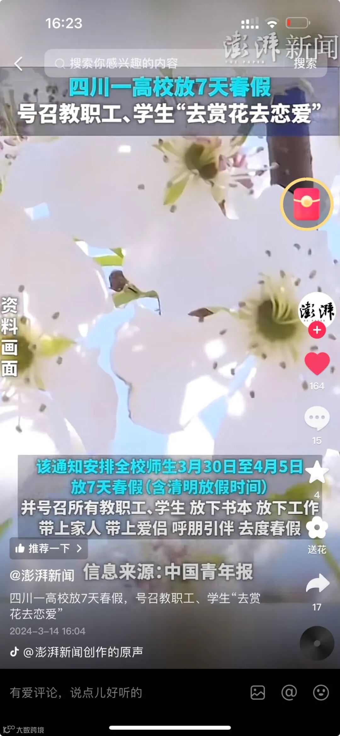 “四川一高校放7天春假”“高校放7天春假鼓励赏花恋爱”的话题,持续发酵,在多个新闻客户端的头条推送、还登上了抖音、微博、微信搜索等实时热度榜单……