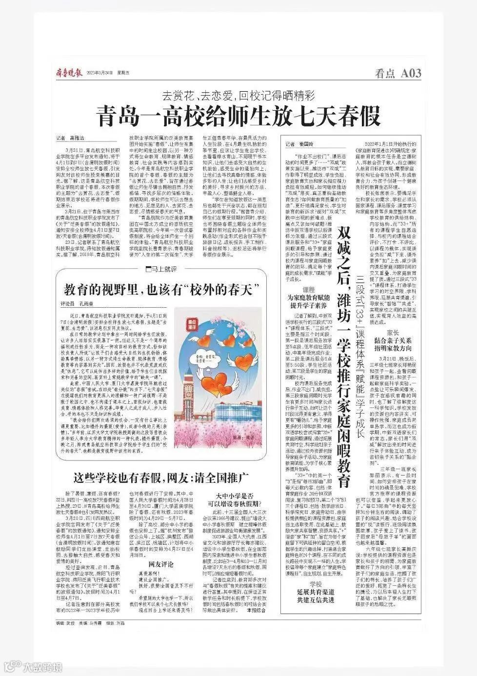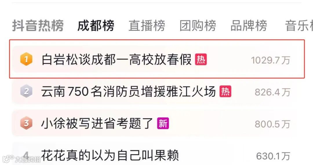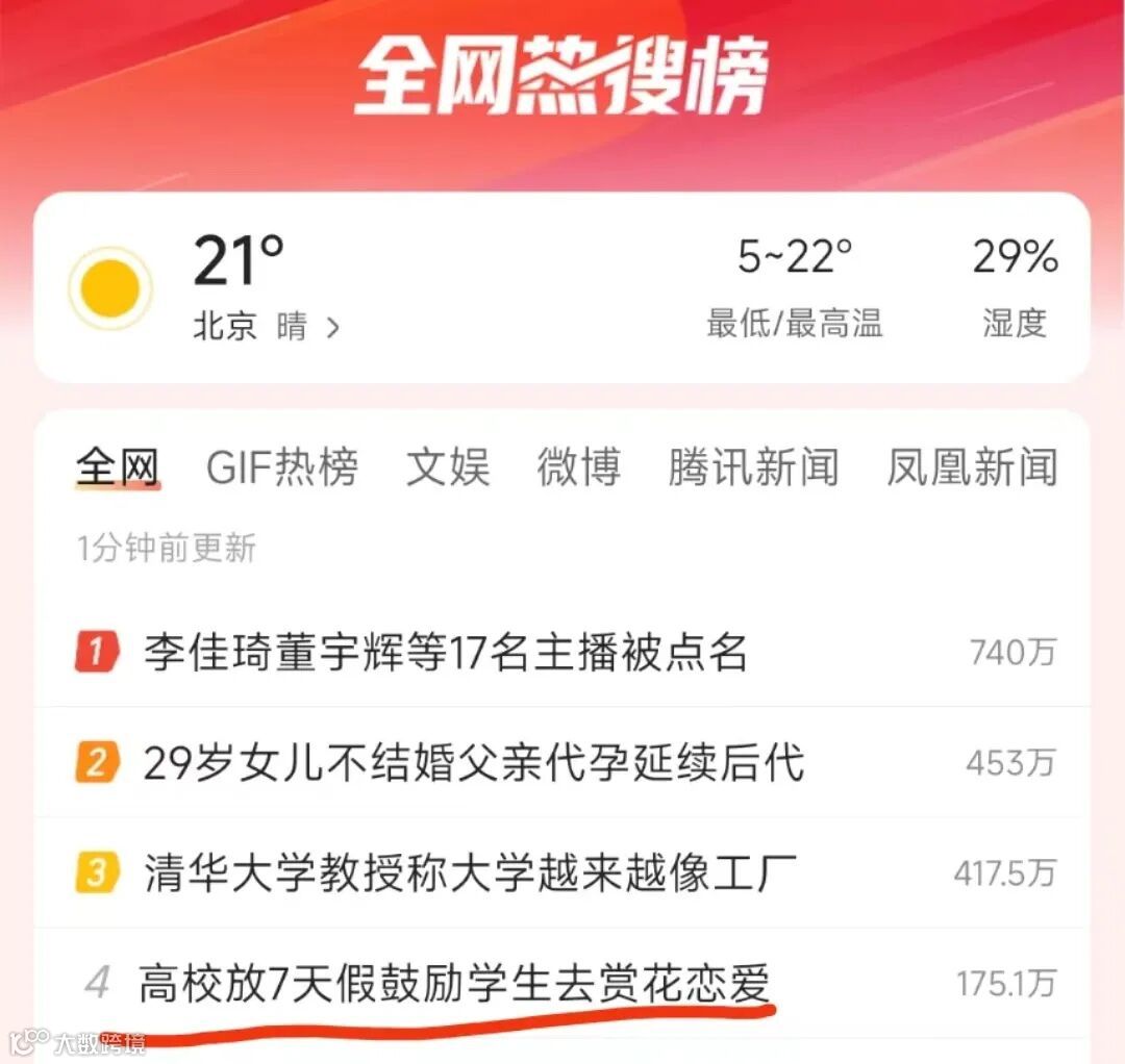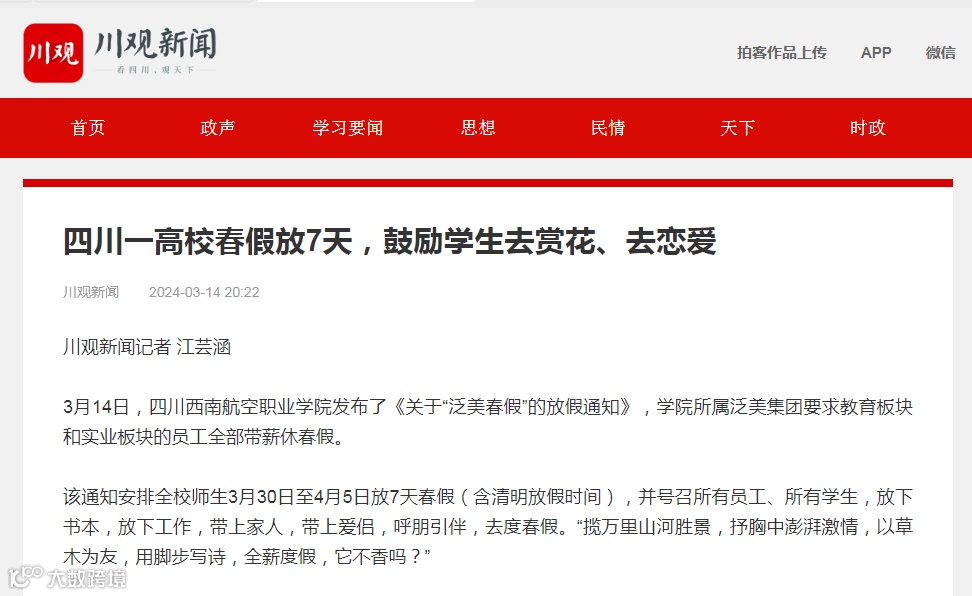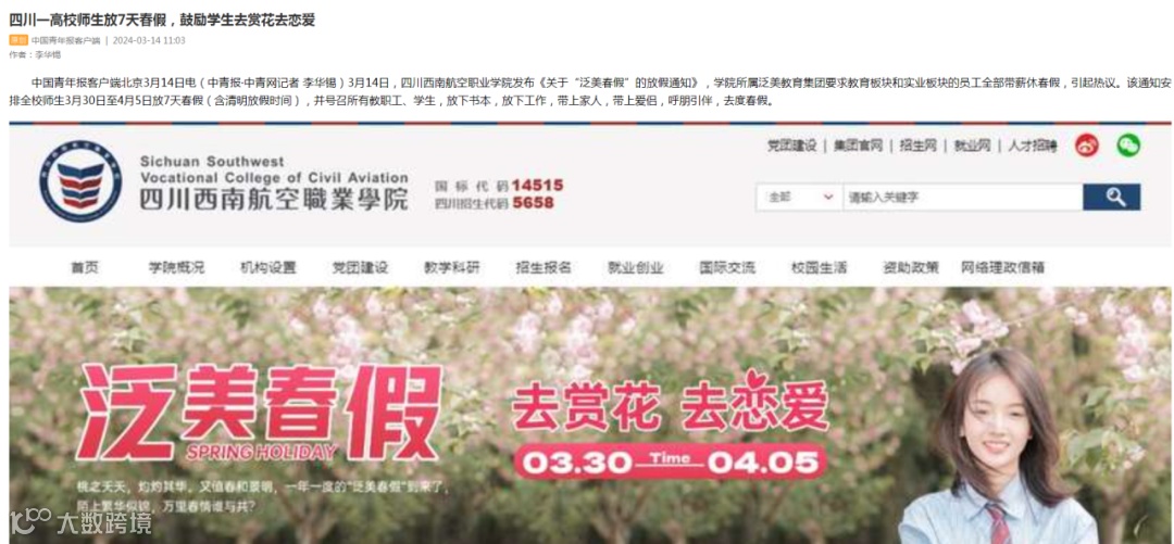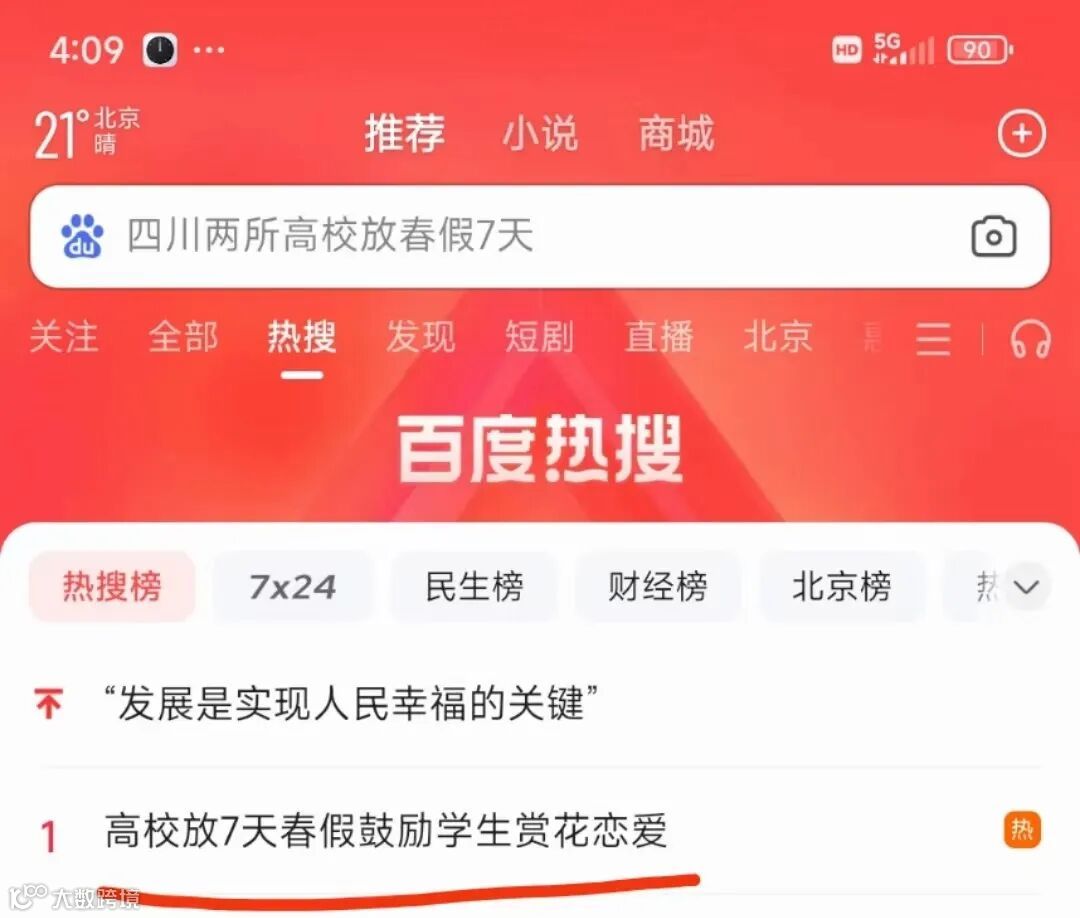 “四川一高校放7天春假”“高校放7天春假鼓励赏花恋爱”的话题,持续发酵,在多个新闻客户端的头条推送、还登上了抖音、微博、微信搜索等实时热度榜单……