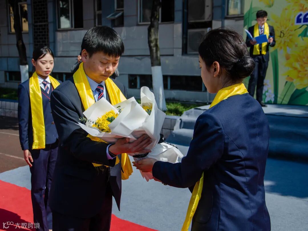 教师代表邱庆上台向革命先贤、先烈敬献黄菊花,全体师生三鞠躬,缅怀革命先烈的丰功伟绩。