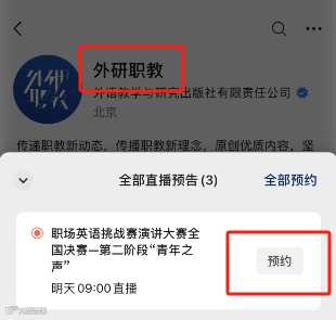▶关注微信公众号“外研职教”,点击“预约”观赛