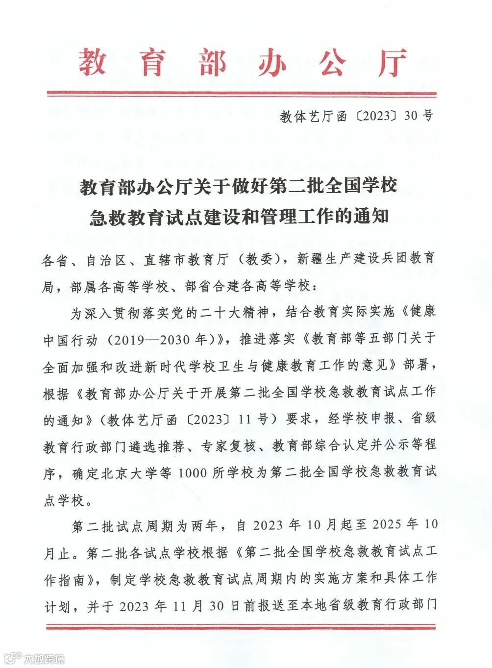 此次评选经学院申报、省级教育行政部门遴选推荐、专家复核、教育部综合认定并公示等程序,第二批试点周期为两年,自2023年10月起至2025年10月止。评估合格者将被授予“全国急救教育学校”称号。