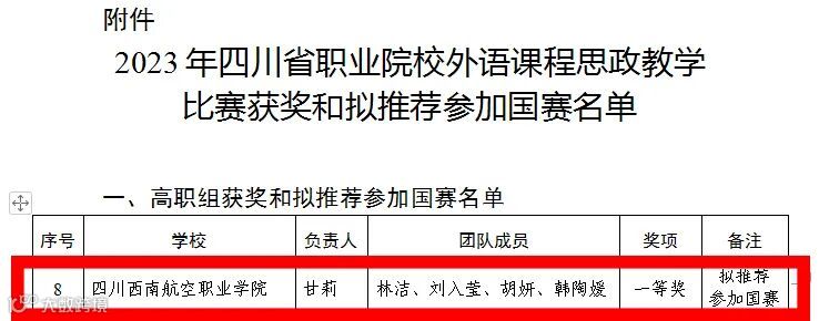 近日,由四川省教育厅主办,四川省高等教育学会高校外语专业委员会、教育部职业院校外语类专业教指委四川工作组、高等教育出版社协办的“2023年四川省职业院校外语课程思政教学比赛”省级复赛在成都圆满落幕,西航外语教学团队(甘莉、林洁、胡妍、刘入莹、韩陶媛)经过激烈角逐,凭借出色的表现荣获四川省一等奖,拟推荐参加国赛。
