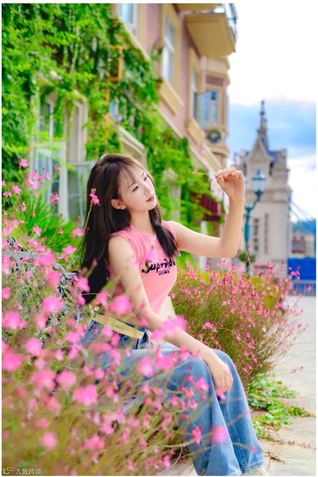 在朦胧美的花朵映衬下