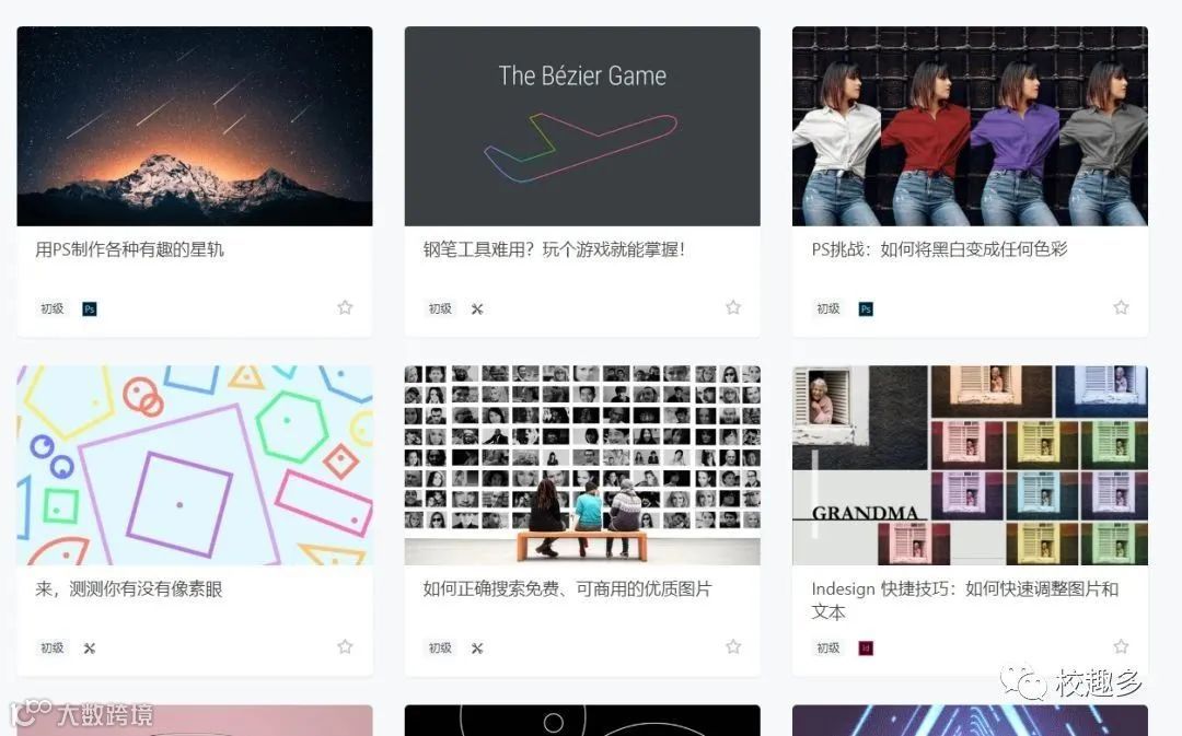 学设计或者想要自学设计的学生必备的网站,提供非常多高质量的免费课程,主要包括平面设计,后期制作,特效合成,三维动画,音乐音效;PS,PR,PE等软件教程都有提供。课程依据难度分为不同等级,让你从零基础小白逐步走向高级设计大神。