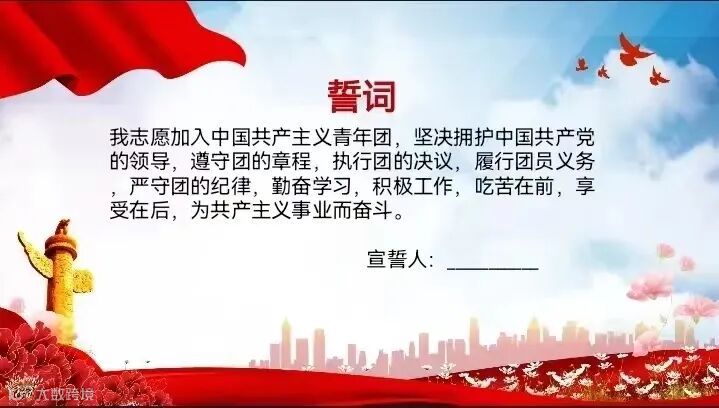 《团章》中规定:新团员必须在代表着团组织的团旗下,举行一次严肃、庄严而富有教育意义的入团宣誓仪式。不要把这次的宣誓仪式只看作一种形式,新团员应该通过这个仪式将自己的入团誓词牢记在心,并以此激励自己作为一名共青团员的荣誉感和责任感。