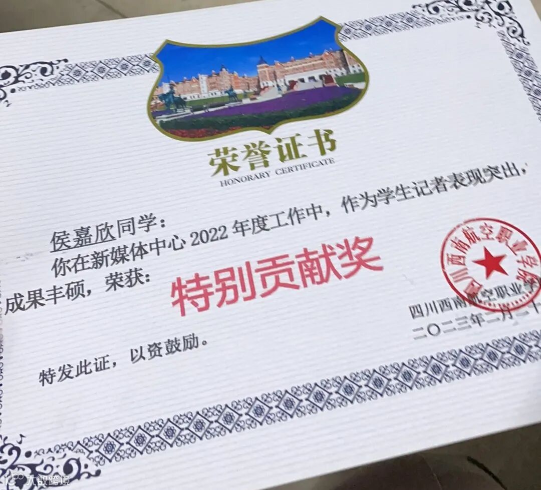 凭借着出众的拍摄技术,勤奋钻研的学习态度,勤恳负责的工作表现,侯嘉欣荣获了新媒体中心的“突出贡献奖”,并成功竞选为新媒体中心的主席团的一员,“至今结缘摄影已五年有余,而在西航的这些经历,让我渐渐找进一步找到了自己的目标和方向。”