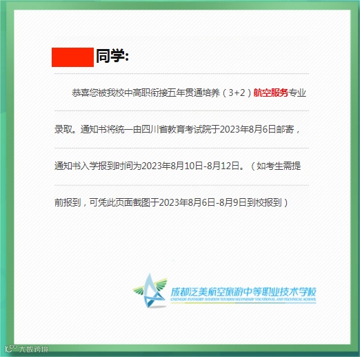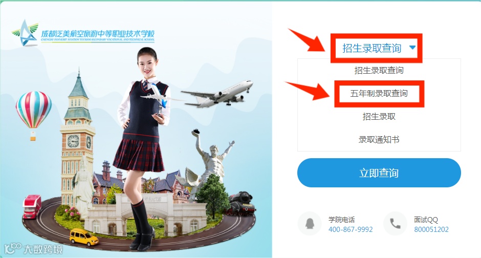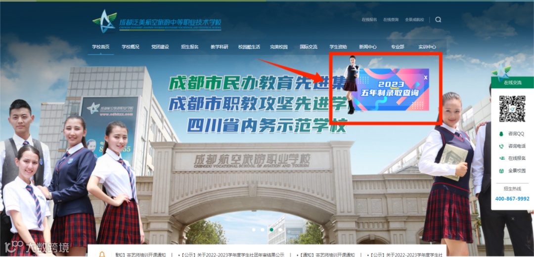 ①登录成都泛美航空旅游中等职业技术学校官网(https://www.cdhkxx.com/),点击2023年五年制录取查询飘窗进入查询主页;