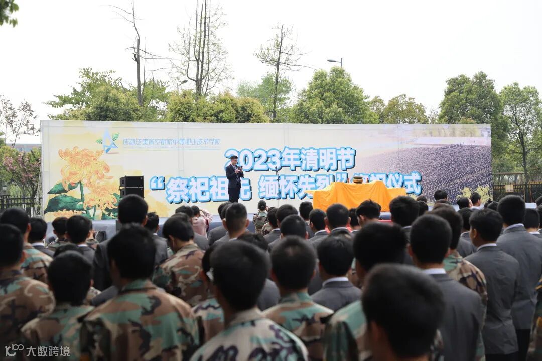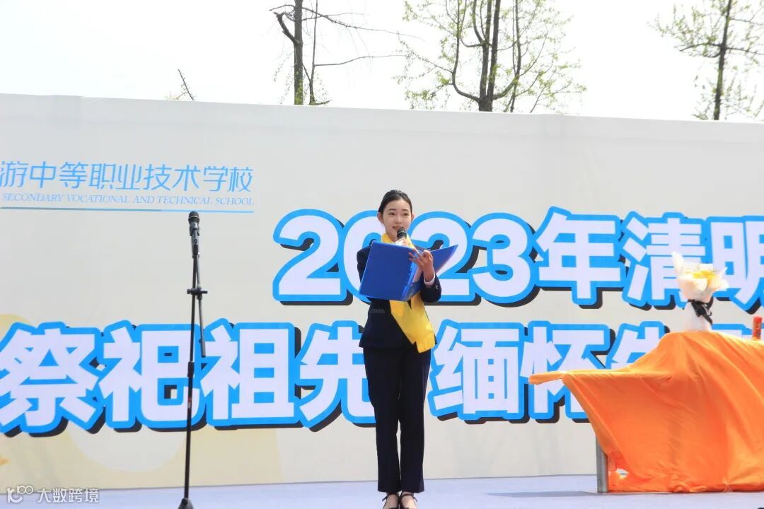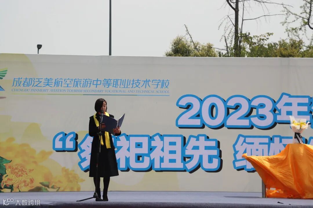 成都泛美航空旅游中等职业技术学校校长陈敏女士在清明祭祖仪式现场进行主题讲话。