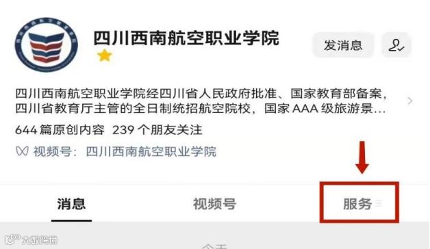 微信搜索“四川西南航空职业学院”公众号,点击标题栏最右侧“服务”进入查询入口;