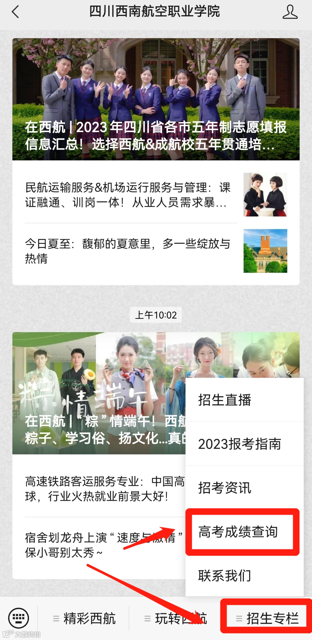 进入公众号后,点击下方菜单“招生专栏”进入“高考成绩查询”界面。