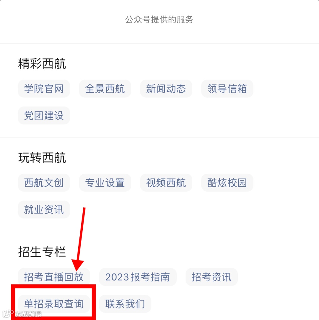 1.微信搜索“四川西南航空职业学院”公众号,点击标题栏最右侧“服务”进入查询入口;