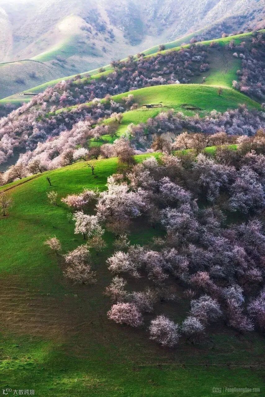 春天时,绚烂的杏花铺展在绿色的山坡上,层次感极强,无论哪个角度,随便一拍都是大片!