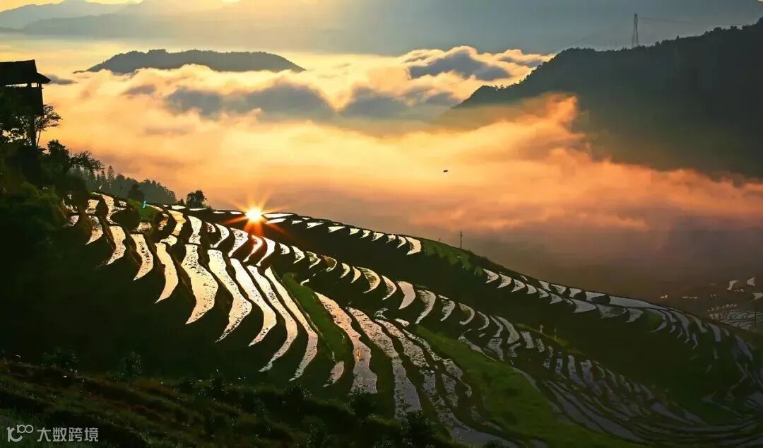 这时灌水的梯田,在阳光下,如明镜般反射光芒,美得格外耀眼,很多优秀的梯田摄影作品,就是在这时候产生的。