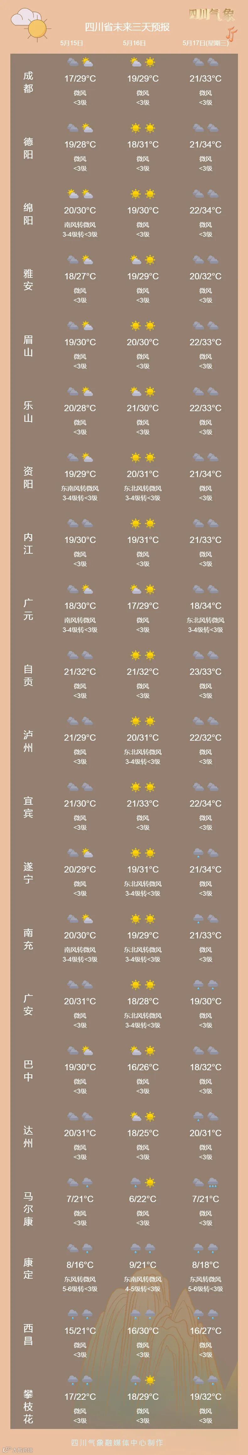 据成都气象,预计未来三天成都以多云天气为主,其中今天午后到夜间,西部山区有阵雨或雷阵雨,天气总体比较热,本周成都最高气温将飙到35℃。