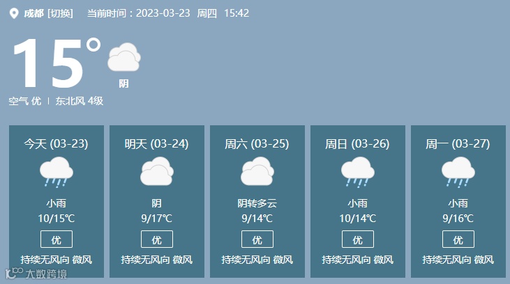目前成都市局部地方已出现大于10m/s的大风天气。预计未来6小时,东部仍有4~6级偏北风,局部地方风力可达7级以上。24日~26日均有雨。参加单招考试时,大家记得带好雨具。
