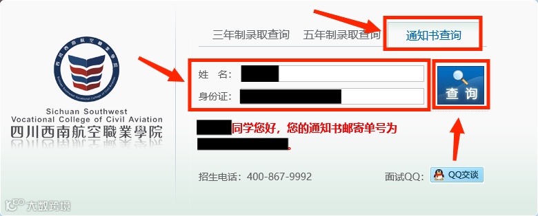 3. 进入后根据提示填写学生姓名及身份证号,填写正确后点击右侧“查询”,即可查看通知书邮寄快递单。