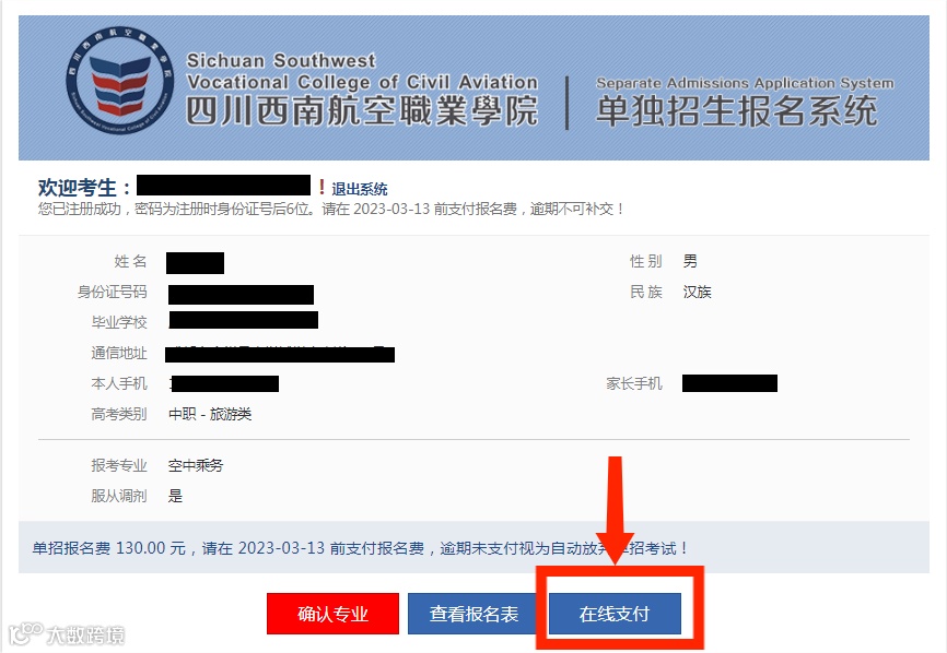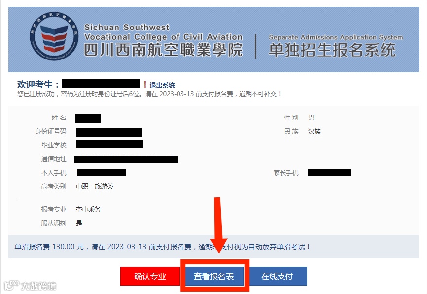 缴费成功后,点击中间“查看报名表”可查看填报信息,3月14日下午14:00考生至学院官网(https://www.xnhkxy.edu.cn)查询是否审核通过获取考试资格,于3月22日至单招考试当日可进入四川西南航空职业学院官网进行准考证打印。