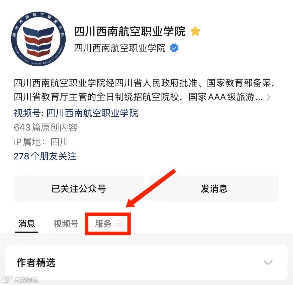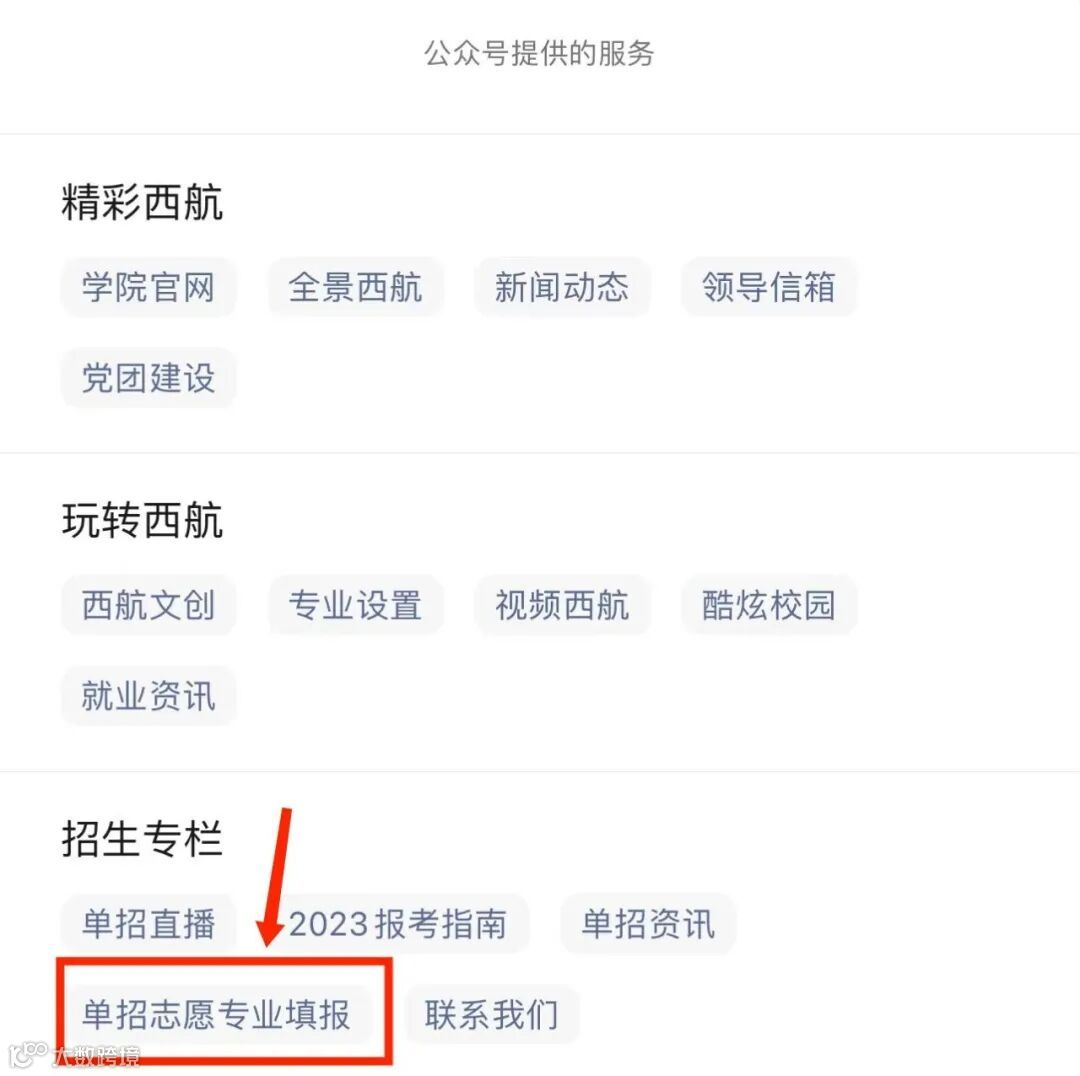 关注四川西南航空职业学院微信公众号(scxnhkzyxy)进行2023年单招志愿专业填报(考生可选填一个报考专业并确定是否服从专业调剂),关注后点击“服务”进入服务栏;