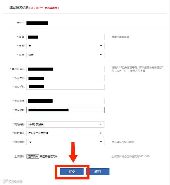 根据提示正确填写加※的必填项目,确认填写无误后点击下方进行“提交”。(考生可选填一个报考专业并确定是否服从专业调剂);