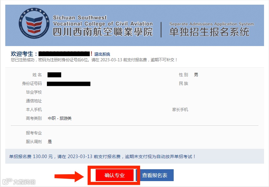 点击“登录”后会出现考生个人信息,确认无误后,点击确认专业;