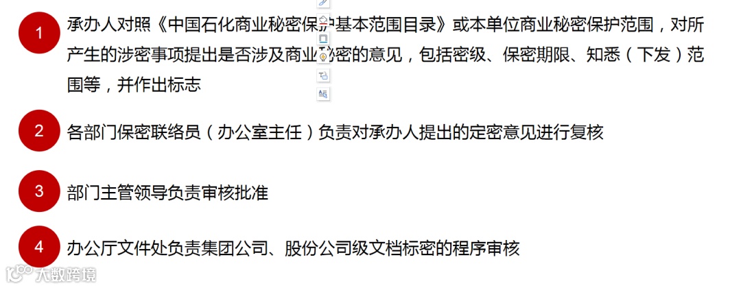 承办人对照《石油石化行业国家秘密范围的规定》及其他《保密范围》“对号入座”,拟定密级、保密期限、知悉(下发)范围等,并作出标志;定密责任人对相关事项进行审核确定