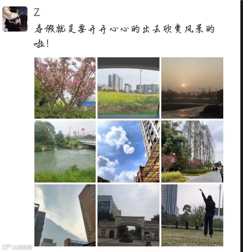 同学们在春假期间,回到家或和朋友结伴旅游。去赏花、踏春。接受感恩教育,开拓眼界。感受其他城市的烟火气息与城市文明。领略不一样的世界,给自己的青春增添色彩,这更是专属春天的特别的回忆。
