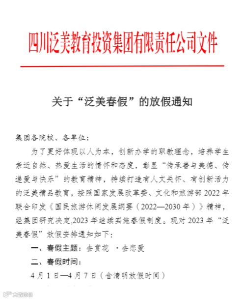 “泛美春假”是泛美教育集团旗下各院校专属的春天假期,旨在培养学生亲近自然、热爱生活的情怀和态度,彰显“传承善与美德、传递爱与快乐”的教育精神。今年我们例行放春假,主题依旧是“去赏花·去恋爱”,希望同学们走出课堂、走出校园,多接触大自然,用心感受到春天和爱情的美好。同时,也希望师生能够走到乡村,关注乡村的发展,寻求乡村振兴的方法。