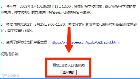 ⑥登录后勾画最下方,“我已阅读以上网报须知”,点击”进入填报”。