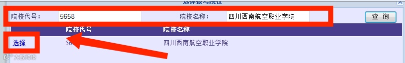 ⑨输入四川西南航空职业学院四川省招生代码:5658 或 院校名称:四川西南航空职业学院,点击查询,然后点击学校序列最前方“选择”。