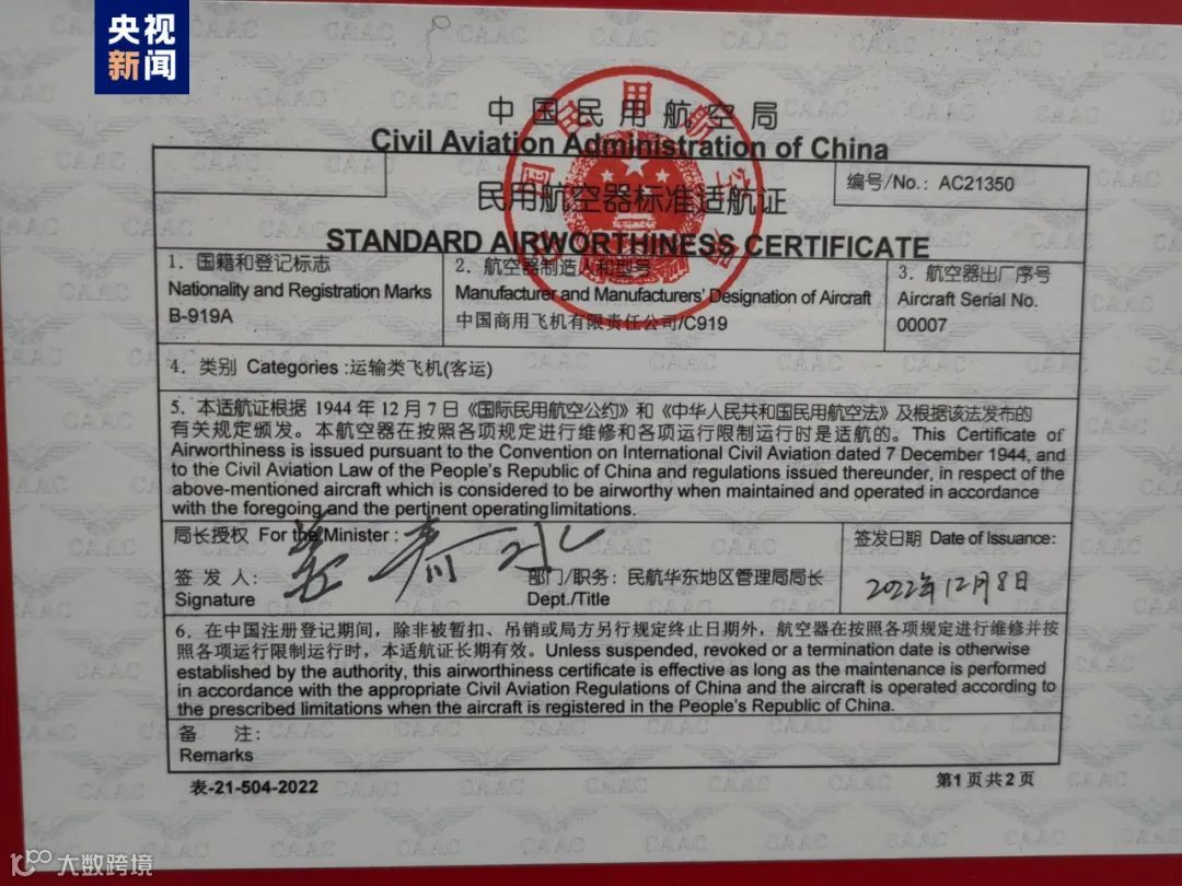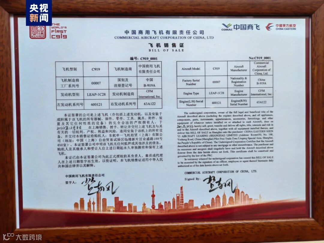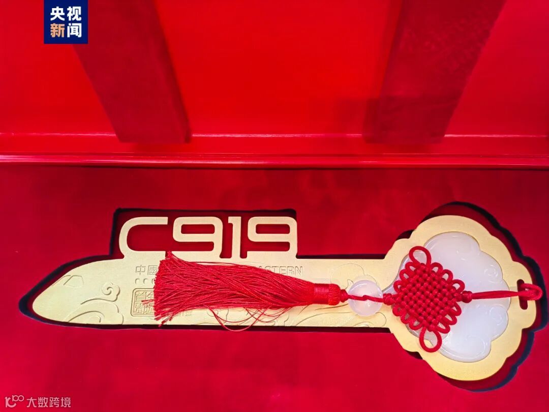 今天(9日)上午,全球首架C919正式交付中国东方航空。就在刚刚,中国商飞向中国东航交付“C919全球首架纪念钥匙”,并颁发了飞机销售证;中国民航局向中国东航颁发国籍登记证、单机适航证(AC)、电台执照。