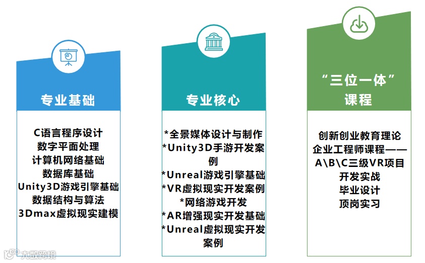 依据行业及企业岗位标准设置了《色彩构成》《Unity物理引擎基础》《PHOTOSHOP图像处理》《三维设计基础》《VR模型建模技术》《虚拟现实程序设计》《VR交互设计技术》《虚拟现实系统开发》等核心课程。