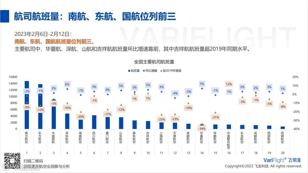 *截至2月12日,今年全国累计执行国内货运航班6,581班次,同比下降17%,较2019年同期增长46%。全国累计执行国际货运航班15,845班次,同比下降37%,较2019年同期增长246%。